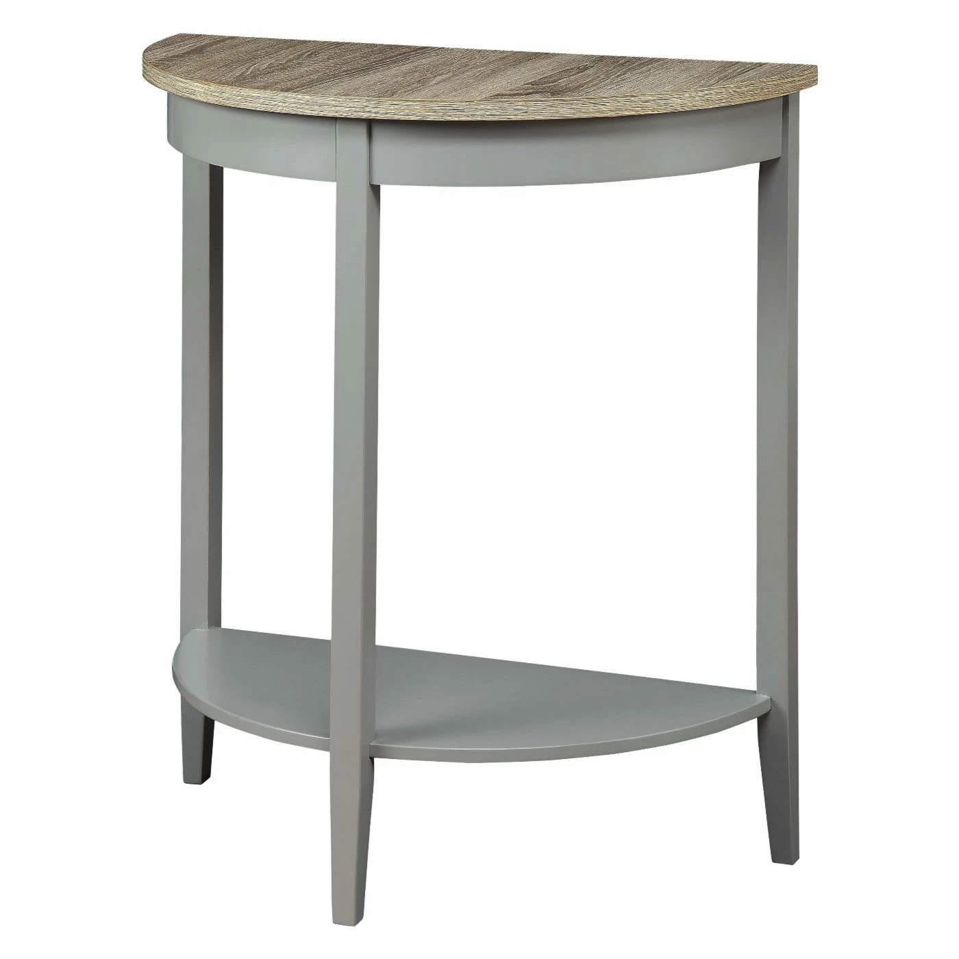 Your entry is the perfect place to showcase the Acme Furniture Justino Console Table. This half-round table features an oak top and a gray base. The lower shelf offers plenty of display space.
