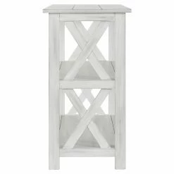 Greet guests with convenient storage in your entryway with the Boraam Jamestown Rectangular Entryway Table. This entryway table boasts two lower shelves to give you plenty of room for display. The sturdy engineered and solid wood design features rustic trestle detailing. A white washed finish completes the vintage look.