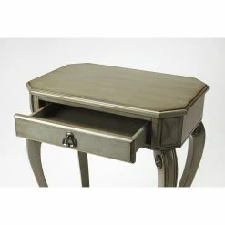 The Butler Specialty Channing Console Table is a striking classical option for storage and display. This console table features a wide top, lower shelf, and pull-out drawer built into its design. The frame is constructed from sturdy wood with curved cabriole legs and is accented with fluted lines for a stylish design flourish. The wood is finished in a brushed stainless steel gray.