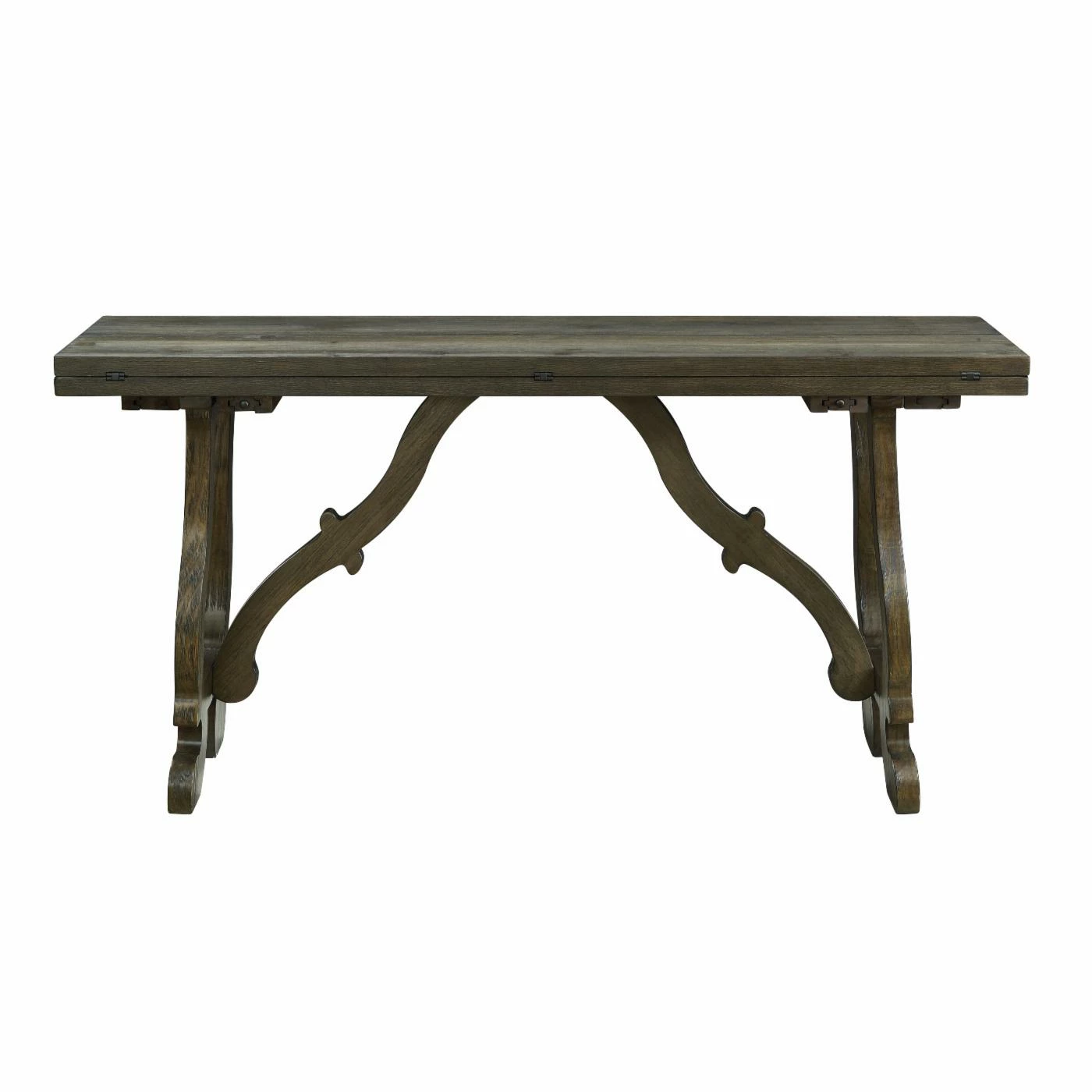 Unfurl its hinged top and watch the Coast to Coast Orchard Park Fold Out Console Table transform from slim entryway essential into a dining table. The table stands on curvy harp legs with matching angled stretchers for an antiqued feel. Its warm brown wood grain finish accentuates the pine wood and lends to the heirloom feel.