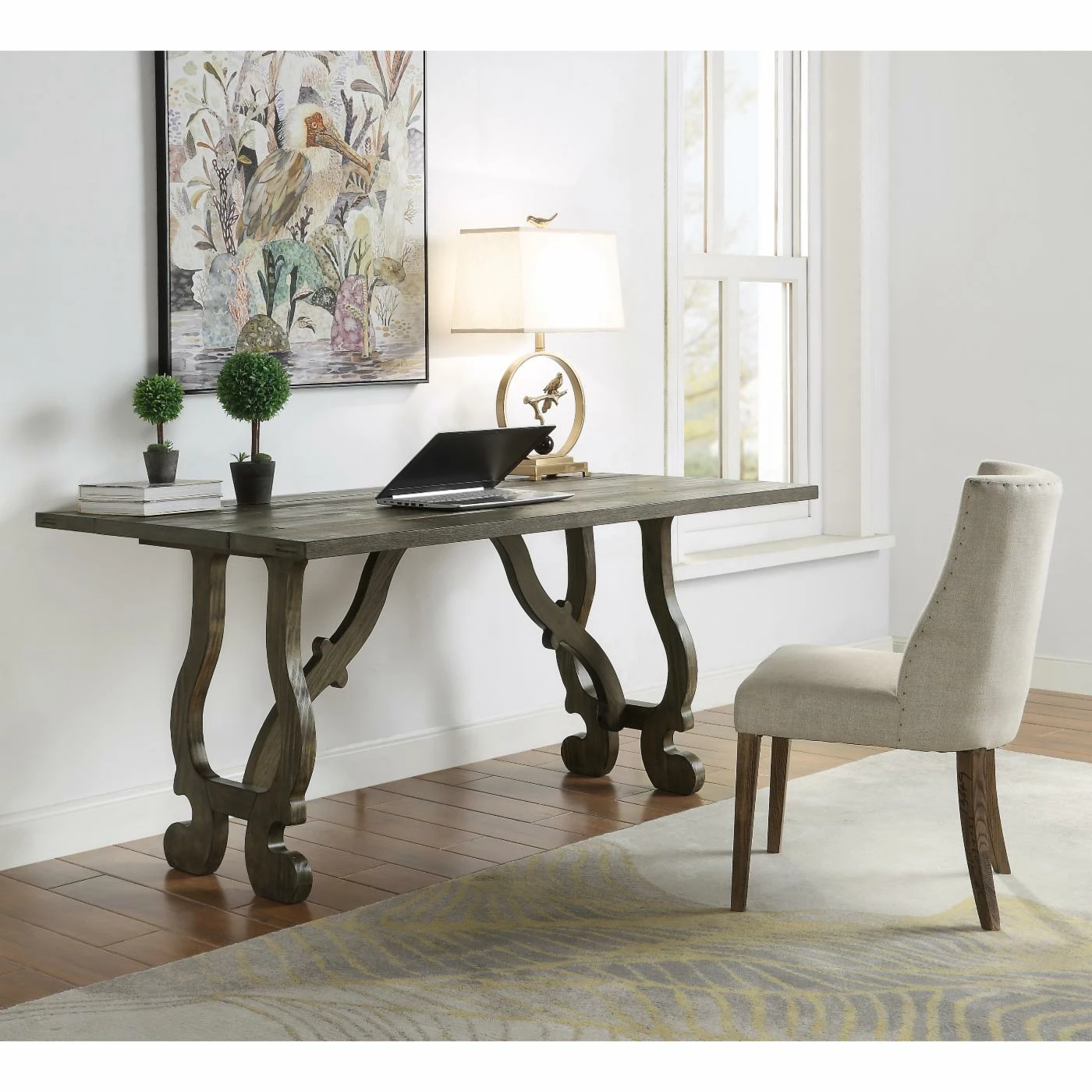 - Harp legs with angled supports and adjustable levelers