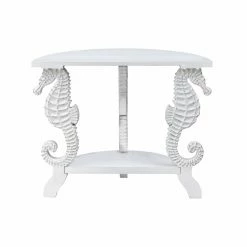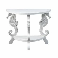 The wonders of the sea are many, and so beautiful to observe, that we just could not resist incorporating some of these into the whimsical Coast to Coast Wonders of the Sea Demilune Console Table. Finished in a brilliant Under the Sea White and with three intricately carved Sea Horses joining the top to the full lower shelf below, this table is perfect for your ocean side retreat. With a lamp on top and a few scattered seashells, this wonderful accent table is sure to bring a smile to everyone who sees it.