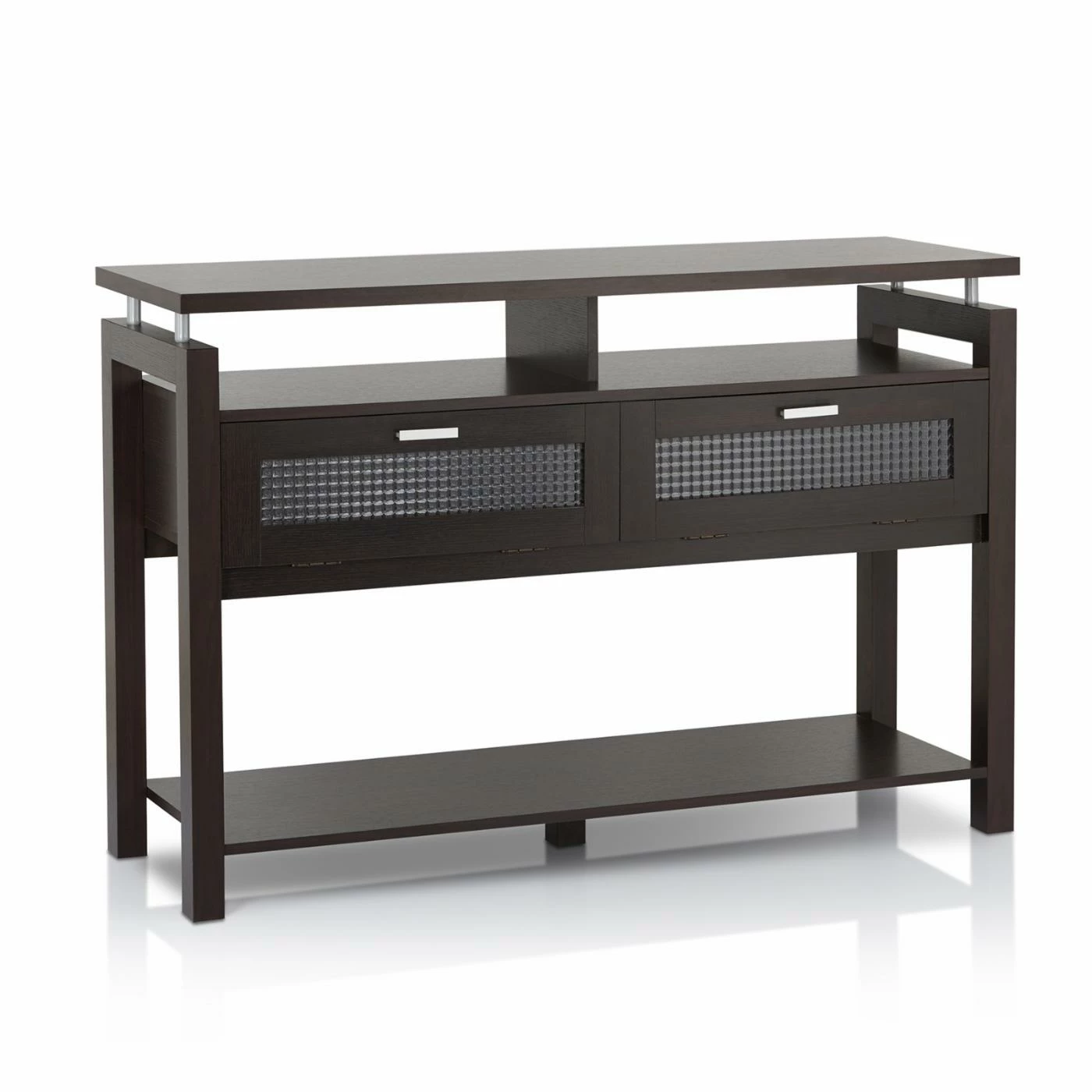 Display and store decorative items, books, and magazines with this Furniture of America Caelon Sofa Table. Perfect for placing in your living room, it’s constructed of engineered wood, veneer, metal, and acrylic for lasting use. It also is equipped with an open shelf and pull-down cabinet for plentiful display and storage.