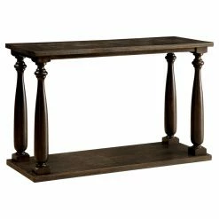 Sleek and casually elegant, the Furniture of America Shandy Transitional Style Turned Leg Sofa Table is crafted of solid wood and wood veneers with a gleaming, dark walnut finish. The sturdy look of this sofa table is perfectly balanced by the open design that shows off your favorite knick-knacks, woven baskets, and pottery. The generously-sized tabletop does double-duty as a decorative display and catch-all for media, reading material, and lighting display. The turned leg design of this sofa table offers versatile styling options for more traditional or transitional dΓ©cor.