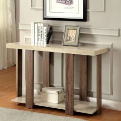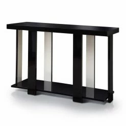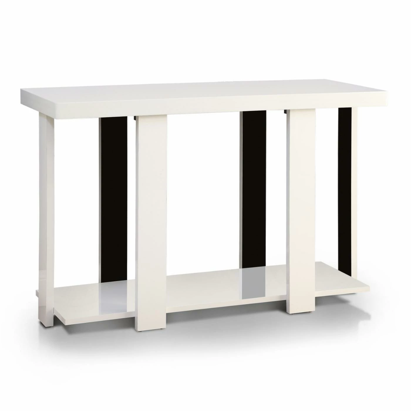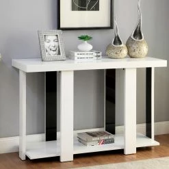 The sleek and modern Furniture of America Tanner Sofa Table is a stunning addition to any home. Crafted from wood with a two-tone finish in your choice of available color, this sofa table complements any home in a winning fashion. The high gloss lacquer coating not only adds an elegant shine, but also helps to prevent scratches and stains. Use the open bottom shelf as added space for displaying your favorite decorative items.