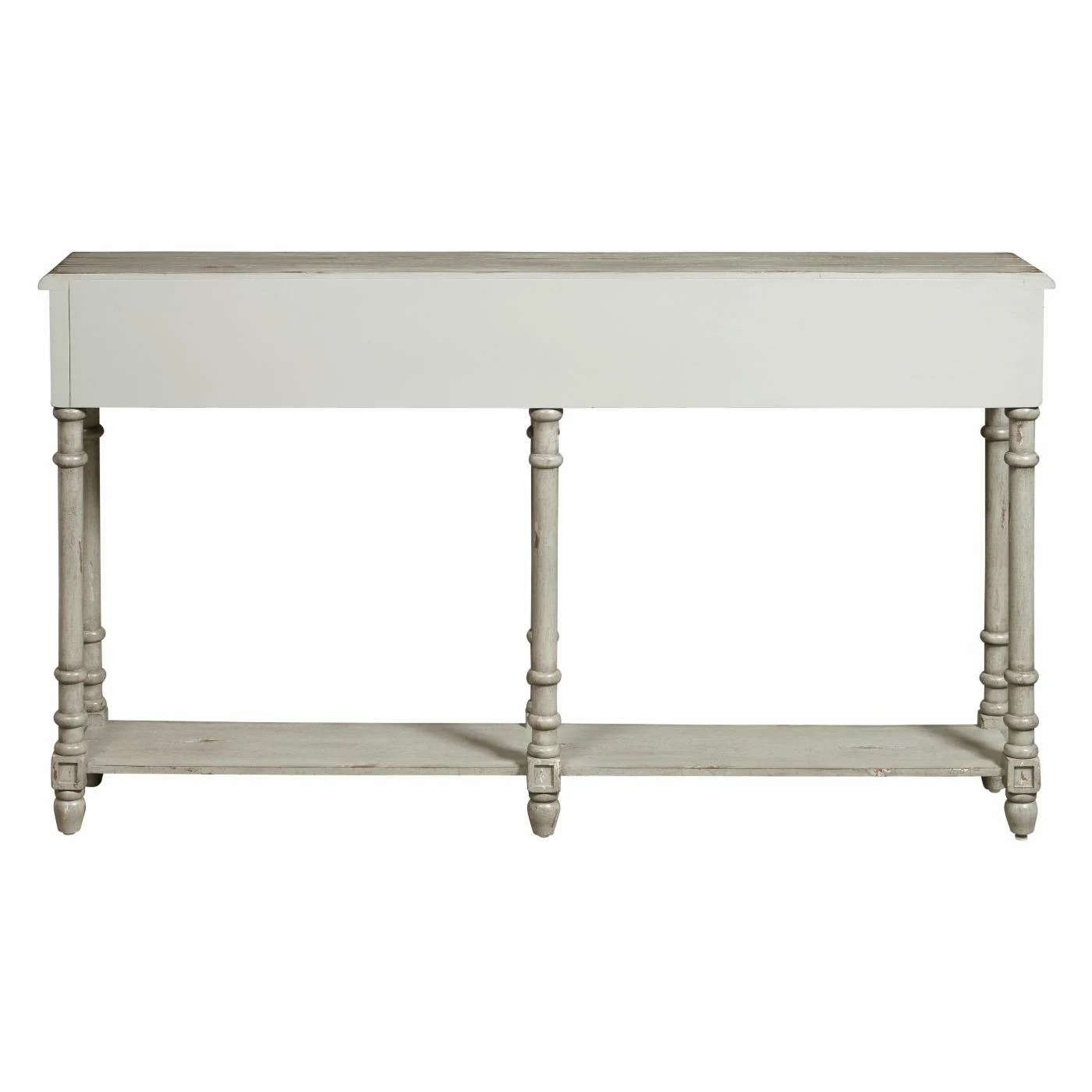 The HomeFare Distressed 2 Drawer Console Table is full of thoughtful details that make it easily mistaken for a real vintage find. Long and slender legs have turned knobs which draw the eye and each drawer has two antiqued brass ring pulls. And, of course, the table is finished in a soft gray which has been heavily distressed by hand to reveal the wood undertones beneath. Use the console top or the lower fixed shelf to display your favorite decorative accents.