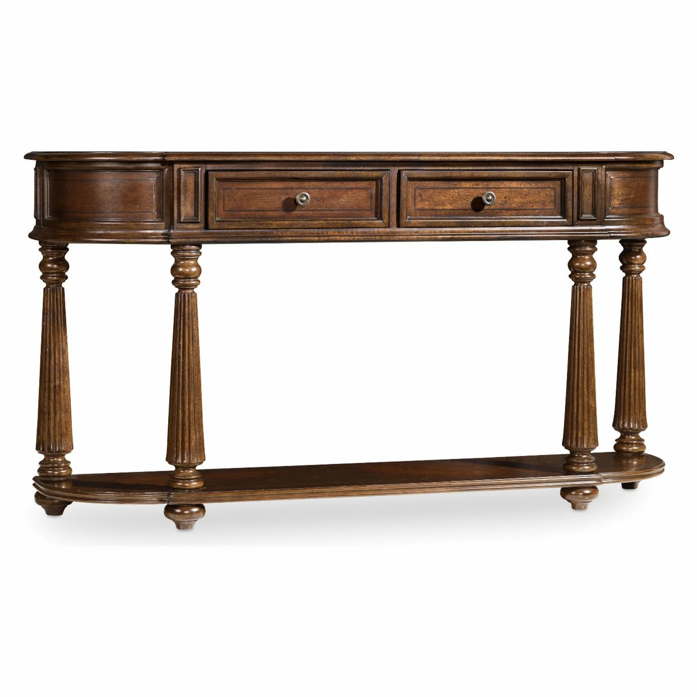 Offered in a practical shape that fits neatly against a wall, the Hooker Furniture Leesburg Demilune Hall Console offers a little concealed storage space, a low shelf that can be used for display, and exquisite mahogany and ebony wood veneers. This table is supported by four massive pillars with a reverse tapered shape and handsome fluting.