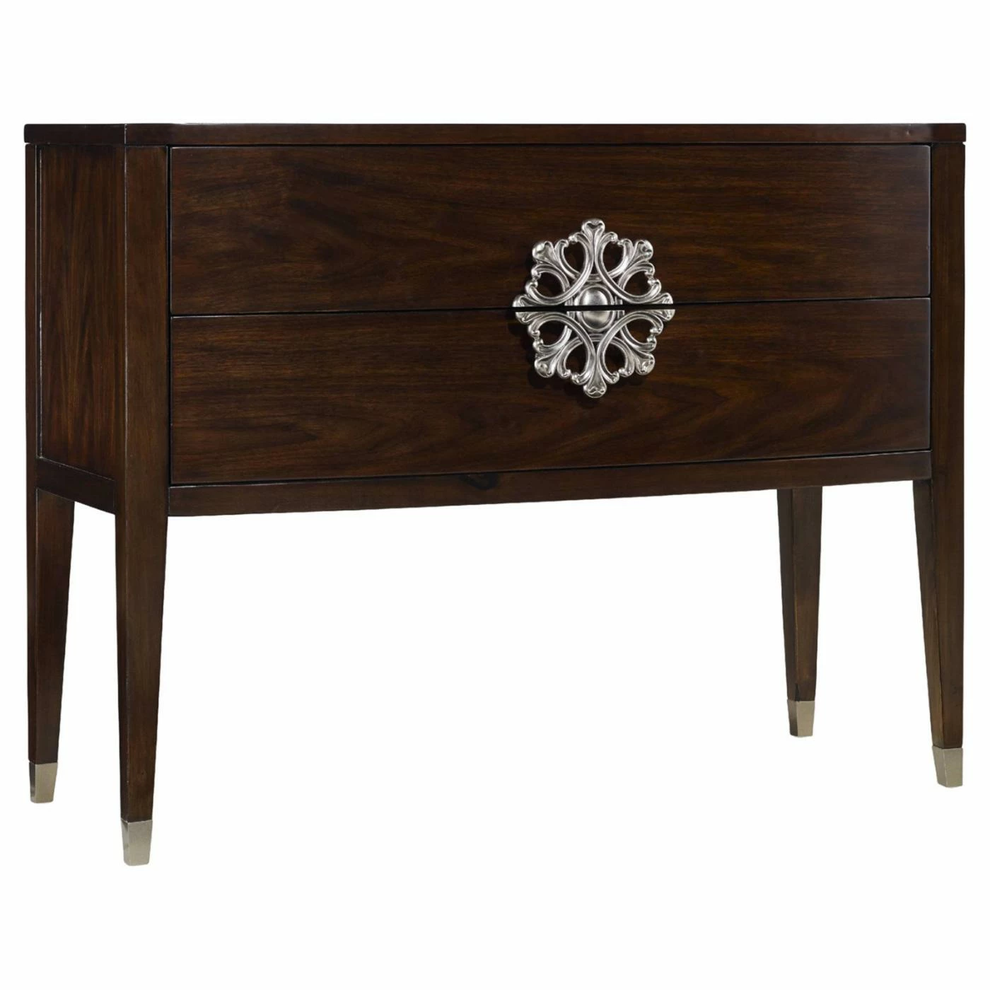 The oversized medallion hardware and metal end caps make the Hooker Furniture Melange Medallion Console Table a dapper addition to your home. This rectangle console table also features two spacious drawers with handsome wallpapered interiors.