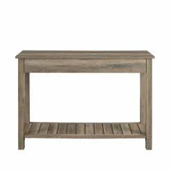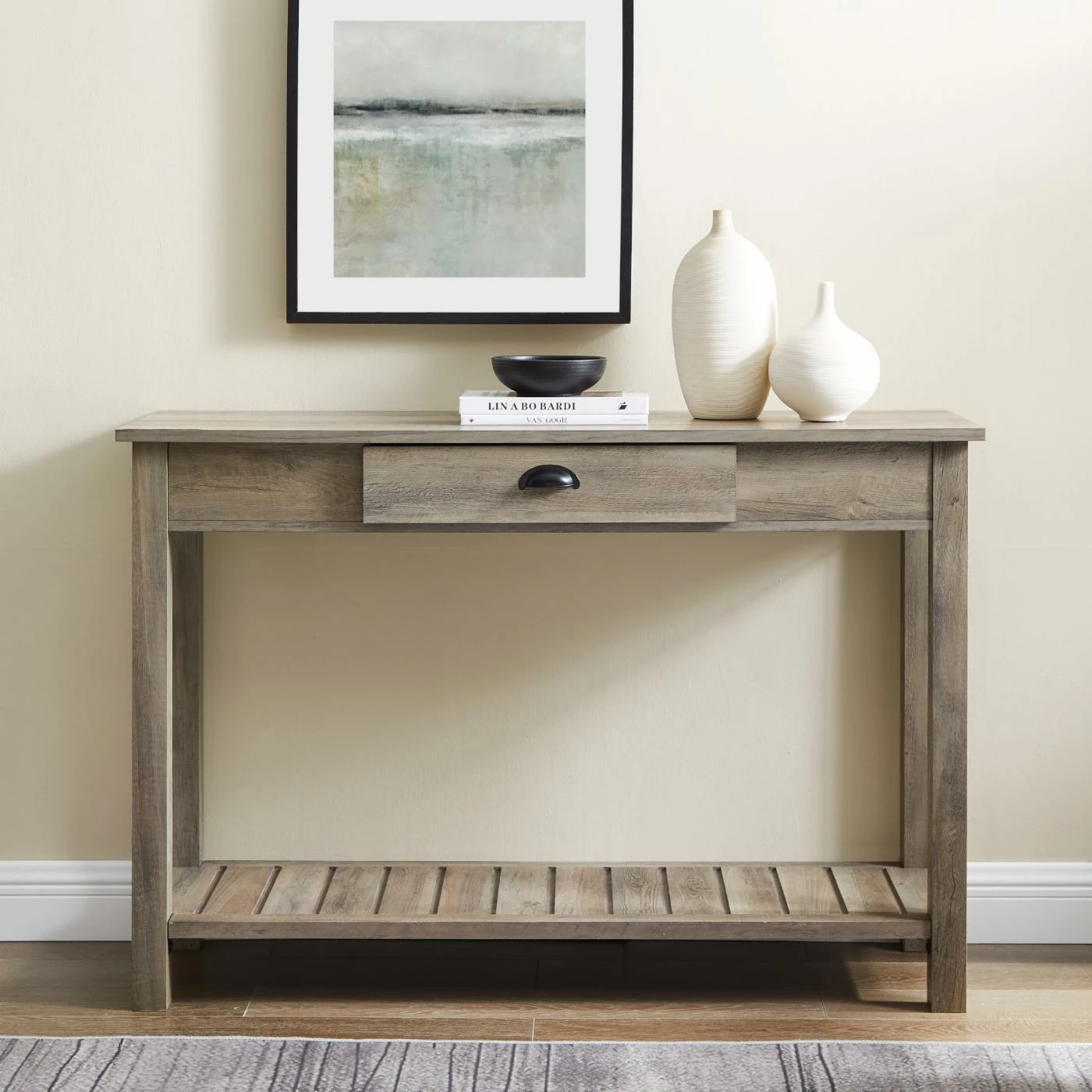 Not only does it offer a farmhouse style that’s inviting and charming, the HumbleNest Farmers Market Weathered Console Table also provides practical function. This console table features a straight-lined design with a central drawer and a slat-style shelf across the bottom.