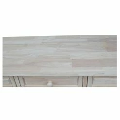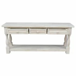 The handsome and handy International Concepts Tuscan Console Table is made from solid wood and graced with heavy turned legs and a slim design that fits anywhere. This console table has three carved drawers, a lower shelf for display, and is left unfinished so you can paint or stain it as you choose.