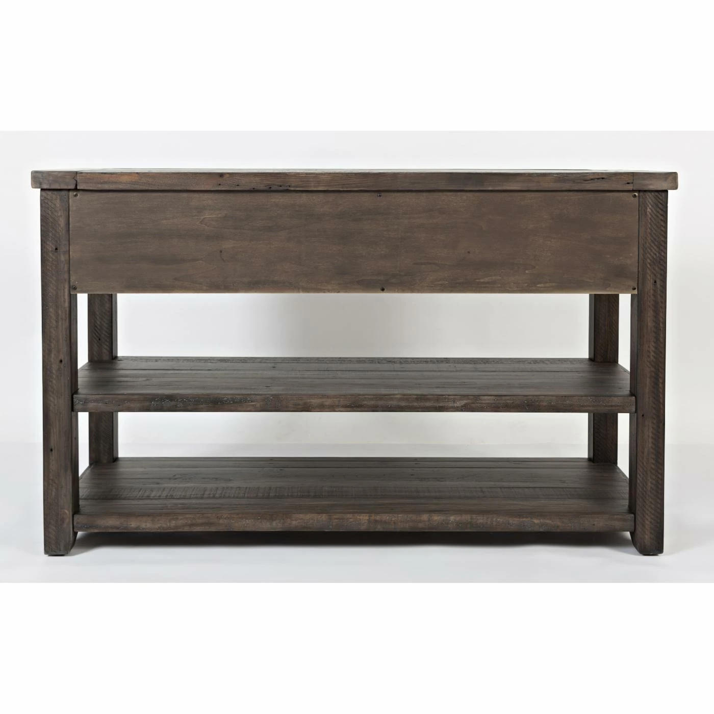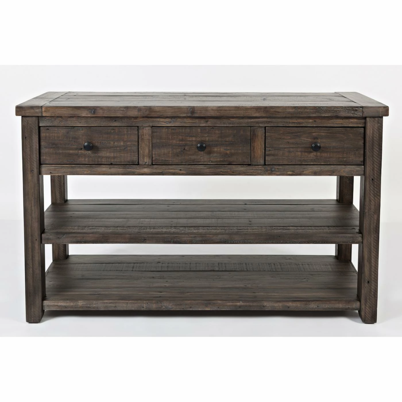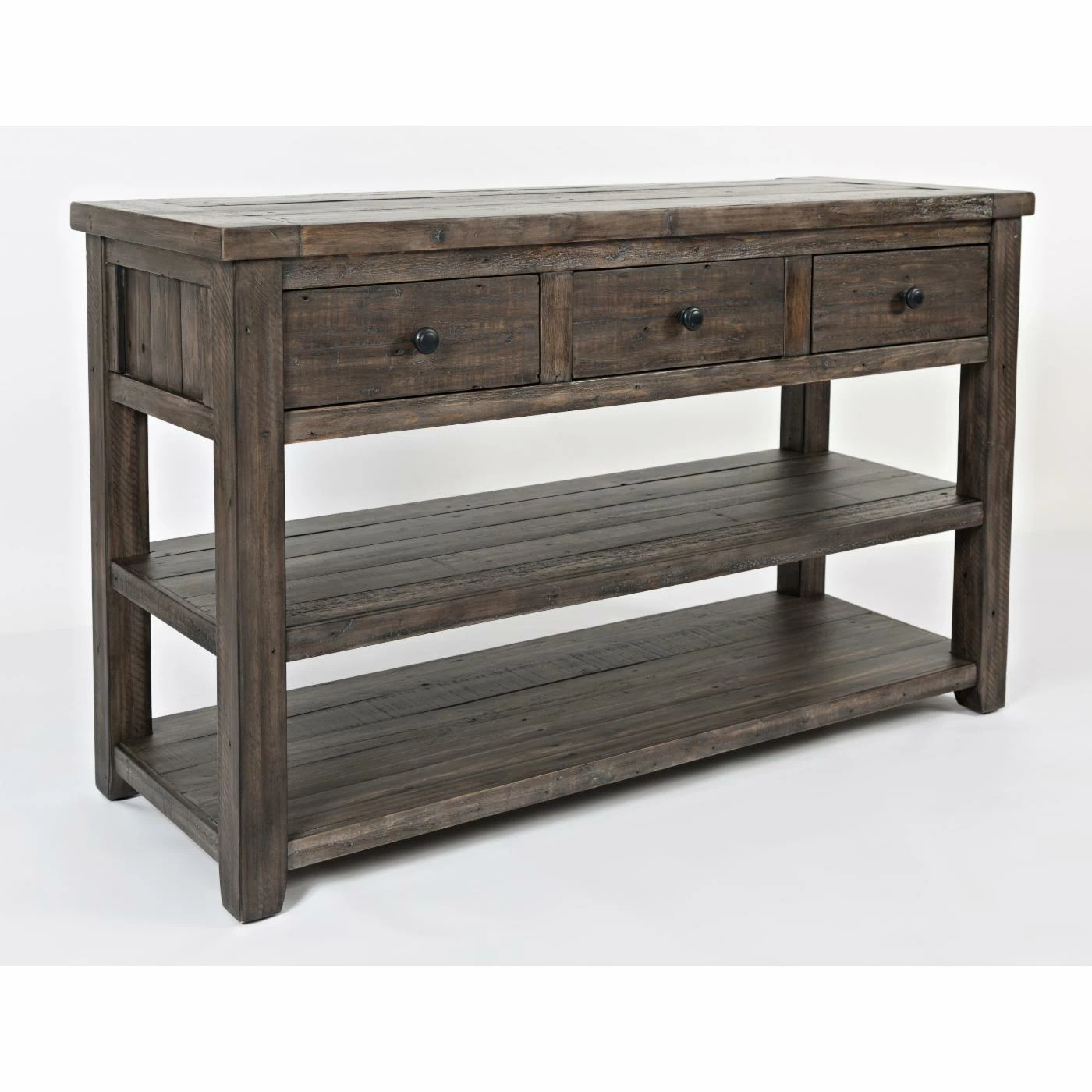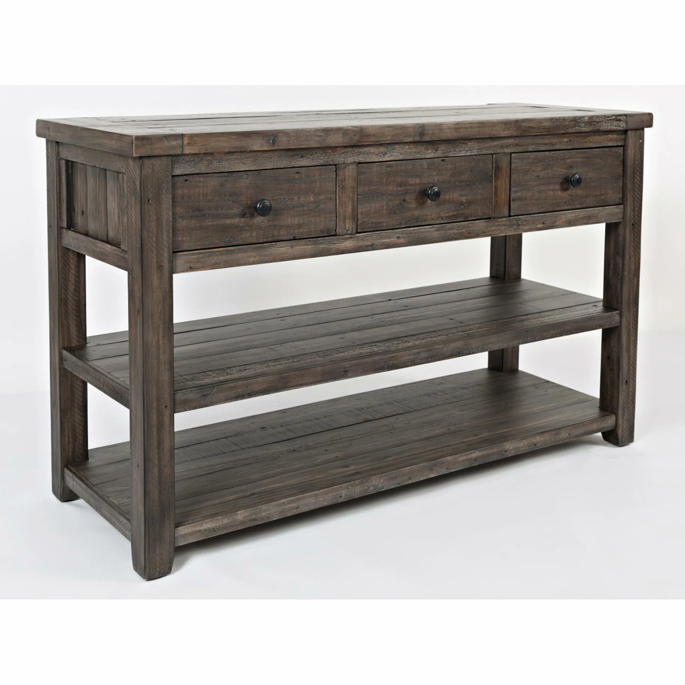 For a rustic farmhouse welcome, style the Jofran Madison County Sofa Table in your entryway. Also great tucked behind your sofa in the living room, this ruggedly handsome table is built of reclaimed pine wood and offered in your choice of available distressed finish options. It includes two generous wood plank shelves for three levels of display and includes three drawers, too.