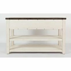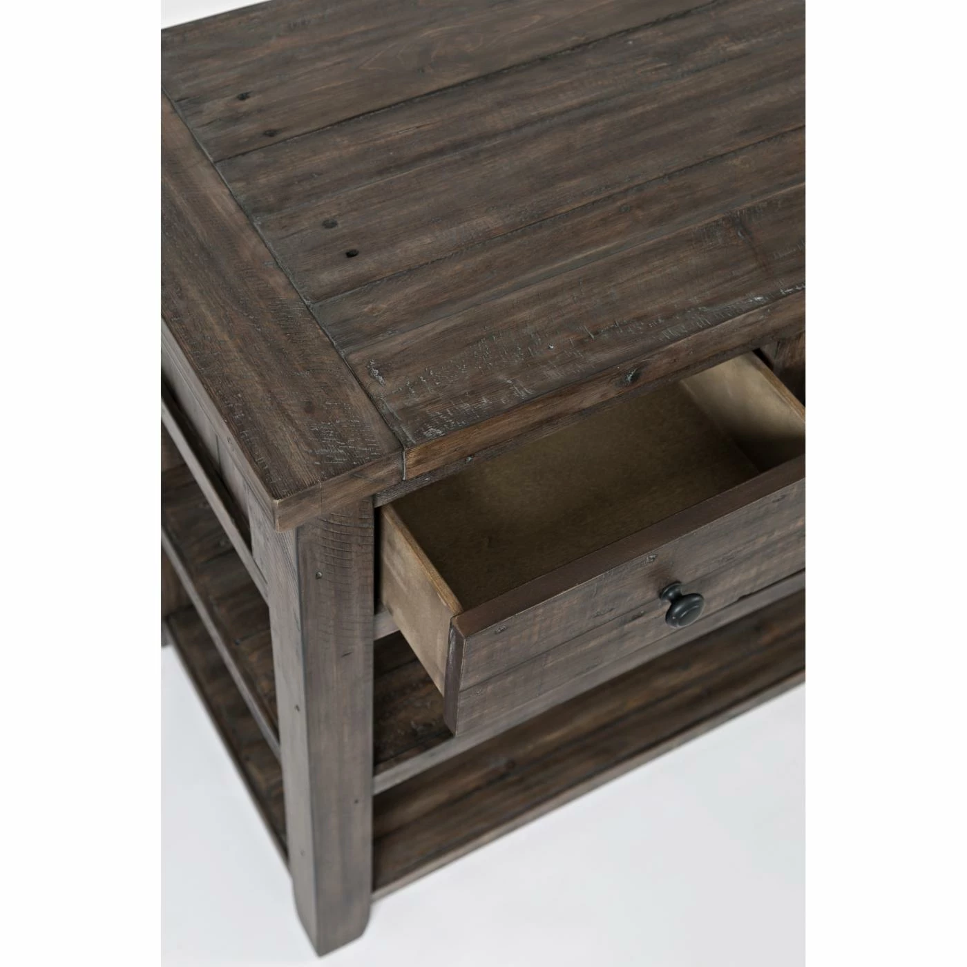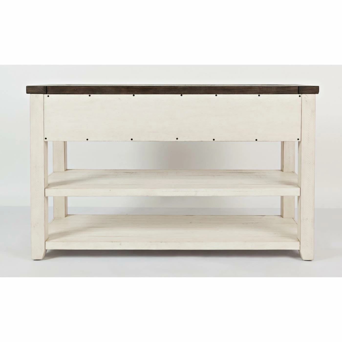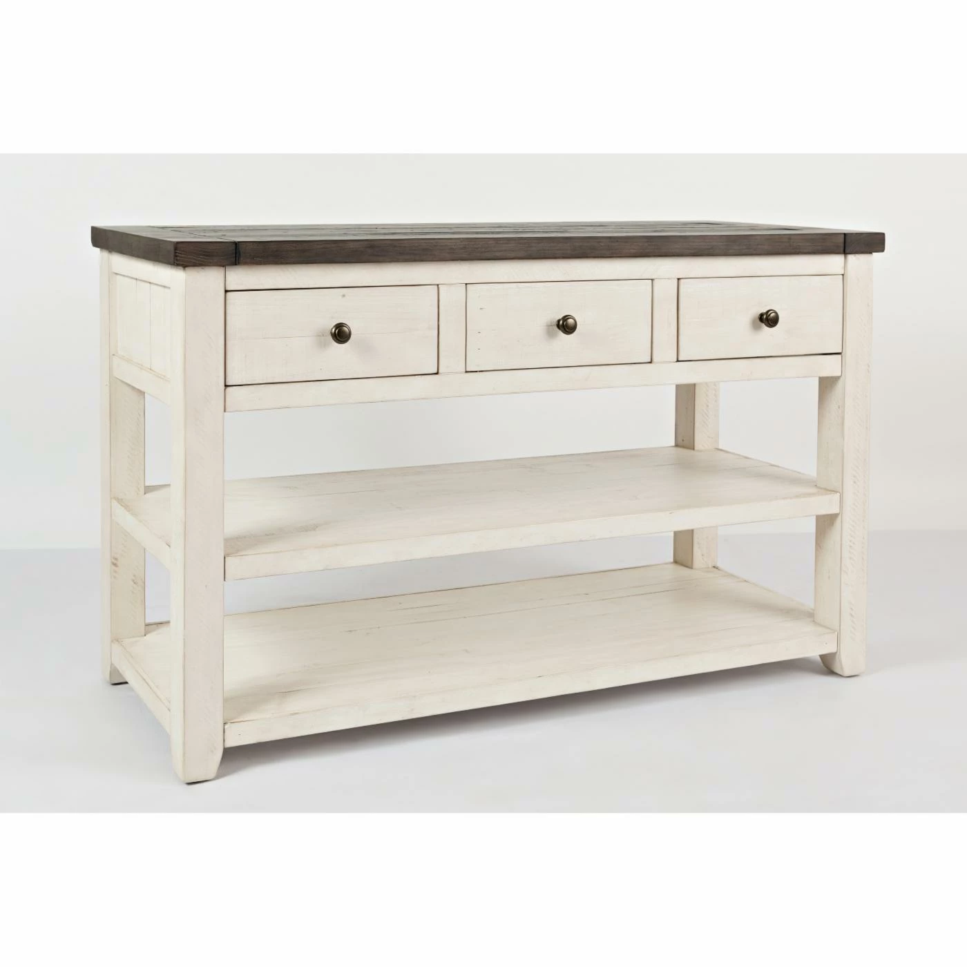 For a rustic farmhouse welcome, style the Jofran Madison County Sofa Table in your entryway. Also great tucked behind your sofa in the living room, this ruggedly handsome table is built of reclaimed pine wood and offered in your choice of available distressed finish options. It includes two generous wood plank shelves for three levels of display and includes three drawers, too.