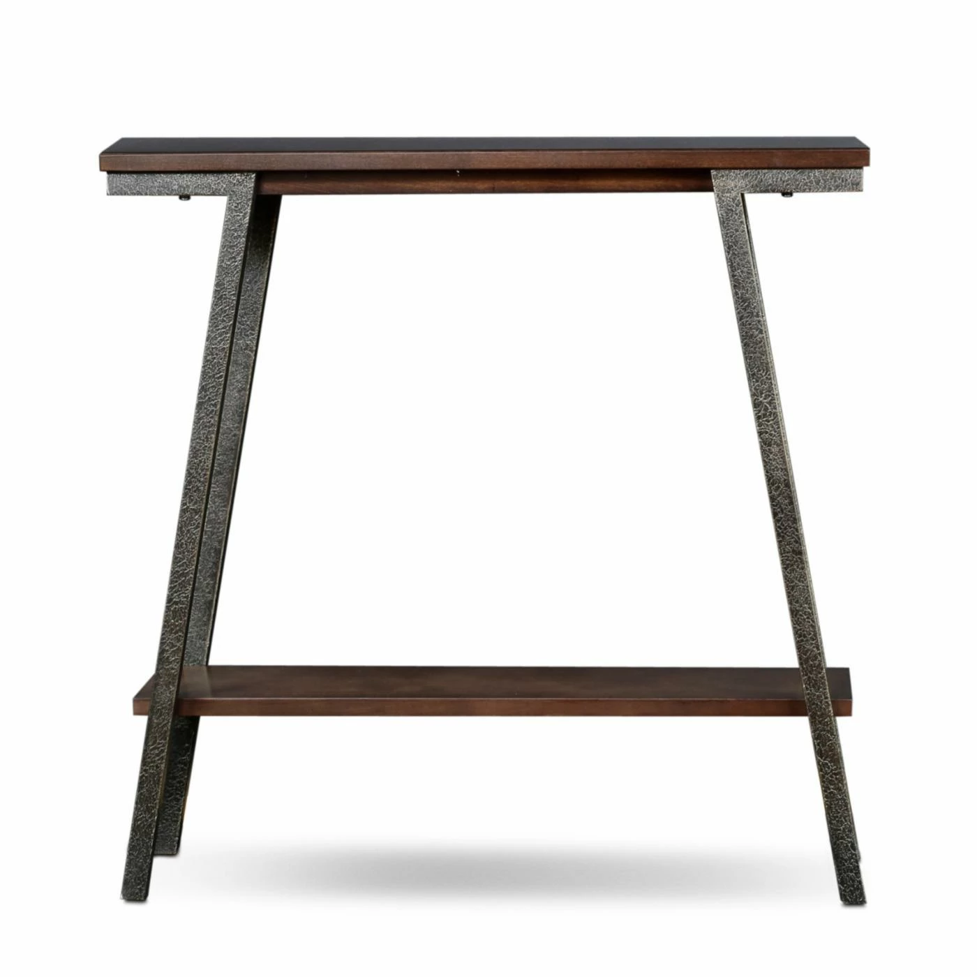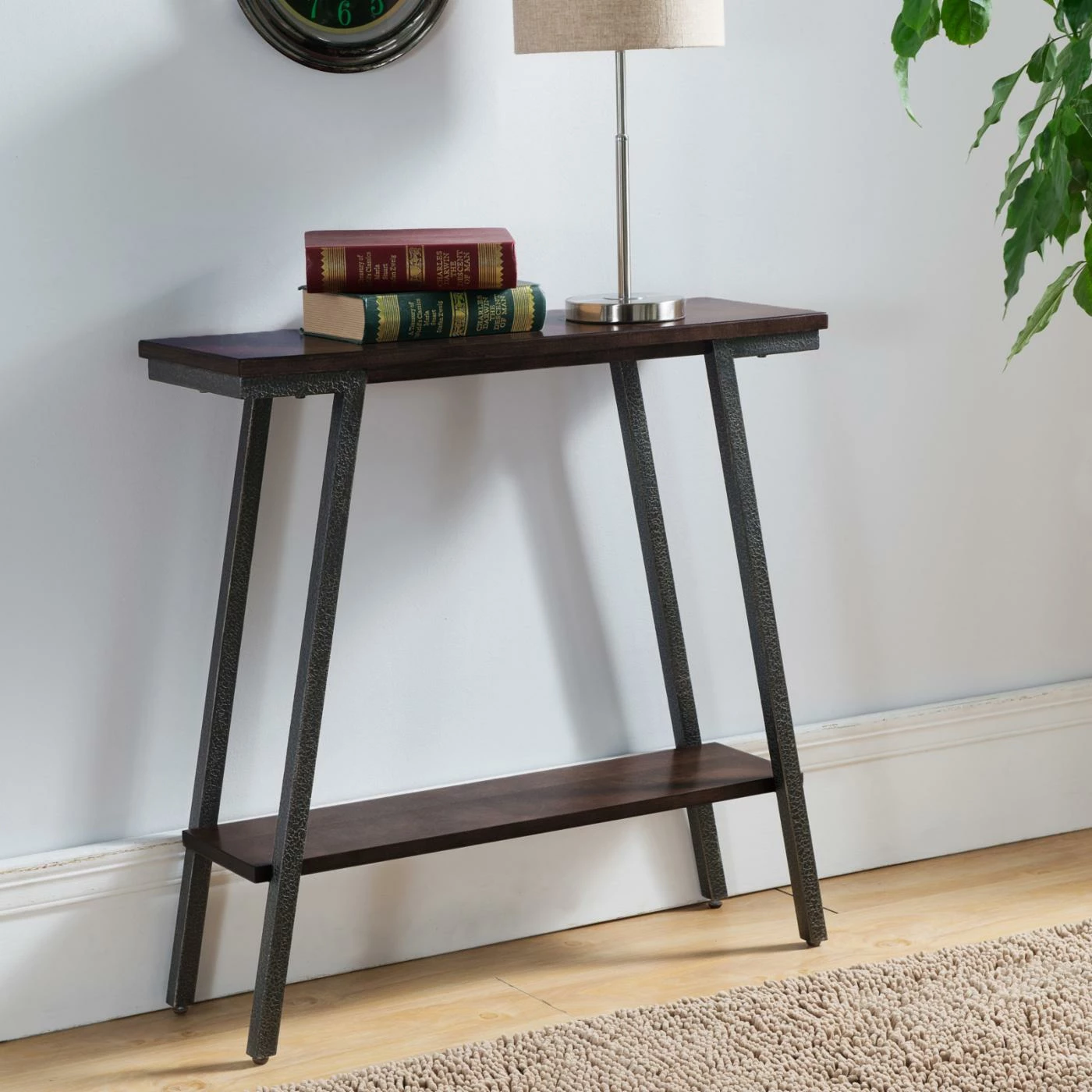 Wonderfully evoking a rustic industrial loft apartment but stylish in most any space, the Leick Home Empiria Hall Stand features a unique canted base and compact footprint that makes a big style statement in smaller hallways and entryways. The solid hardwood and birch veneers are finished in a deep walnut tone, while the steel base is finished in Foundry Bronze, a textured, sooty matte black with bronze highlights. A lower shelf is ideal for displaying your favorite home accents, too.