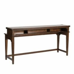 Add bar stools to the back of the Liberty Furniture Industries Aspen Skies Console Bar Table for an interesting style in your bar area. The tapered legs lead up to three small cubbies and a long shelf on the back. This console bar table is constructed from New Zealand Pine veneer. The russet brown finish and metal accents add a rustic style to your home. Pair this piece with other items from the Aspen Skies Collection to complete your home in elegant style.