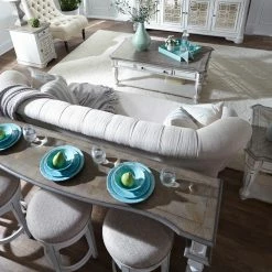 A little extra table space has never looked more inviting thanks to the Liberty Furniture Industries Magnolia Manor Console Table. Whether placed behind a sofa or against a wall, this set, which includes a console table and three stools, is ideal for traditional, rustic, cottage, and farmhouse dΓ©cors. A distressed white finish graces the poplar solids and white oak and birch veneers, while turned legs add a hint of Old World style. Three cubbies under the tabletop provide smart storage, and the swivel seats on the counter stools are upholstered in fabric. Stools fit easily under the table when not in use.