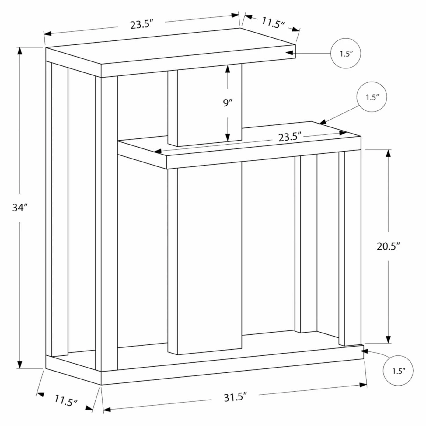 Staggered shelves and a strong, linear design give the Monarch Specialties Staggered Console Table its contemporary appeal. This console table makes the most of your display pieces by allowing natural space in between each level. This means your favorites can shine individually as well as in a group. This versatile beauty is perfect in your hallway, entrance, or anywhere that needs an extra jolt of style. Its durable engineered wood construction includes strong, squared legs, thick shelving, and your choice of select finishes.