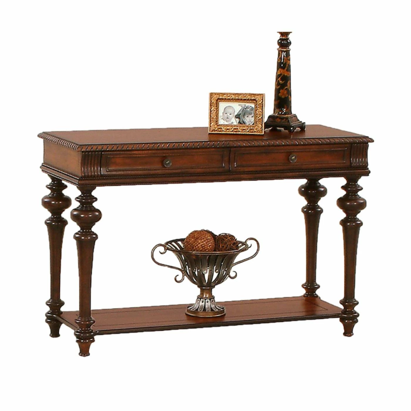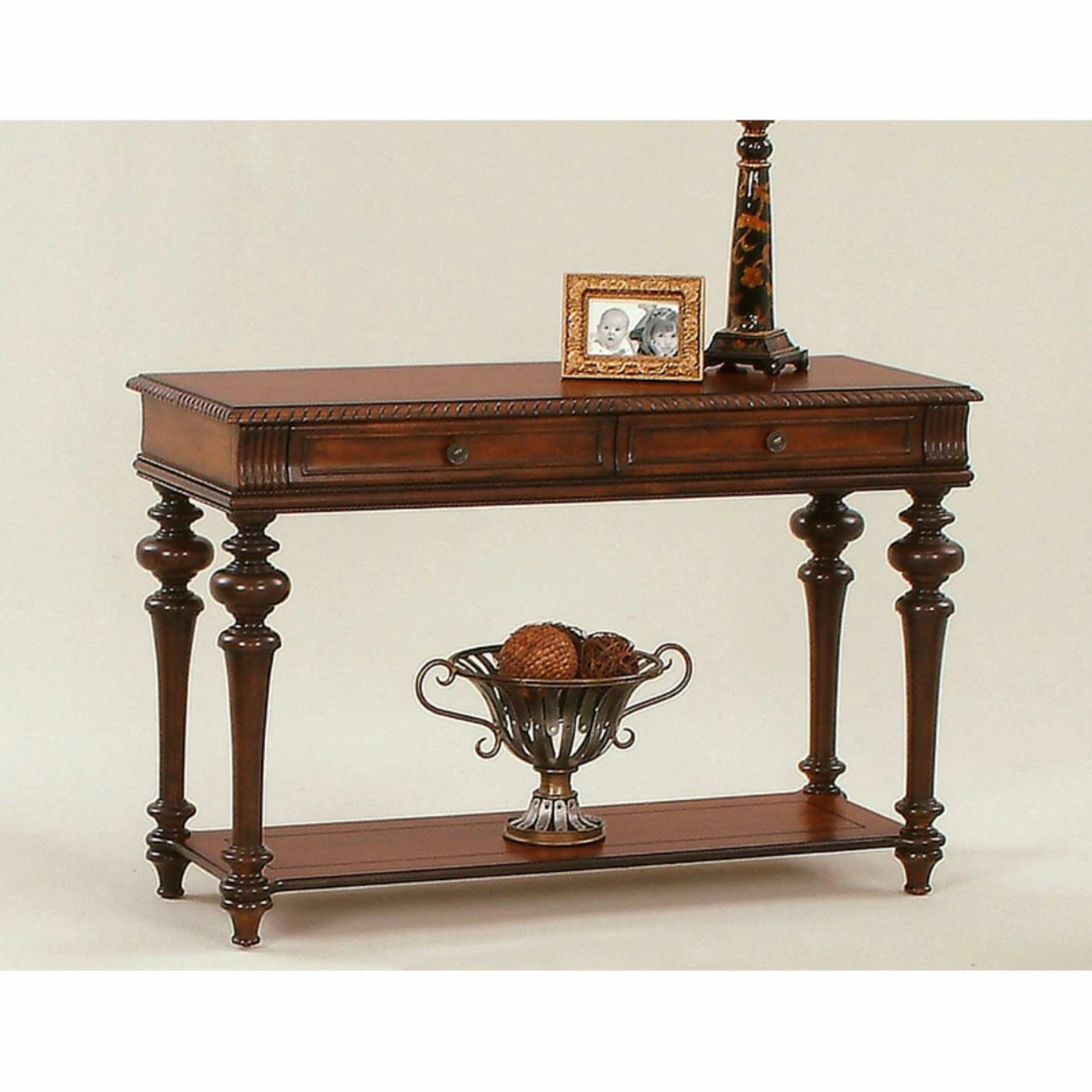 The Progressive Furniture Sofa Table – Heritage Cherry adds elegant beauty to any room. This table is made of solid hardwood with cherry veneers with a striking heritage cherry finish. Turned legs add a distinctive style while 2 spacious drawers and a lower fixed shelf offer elegant storage and display options.