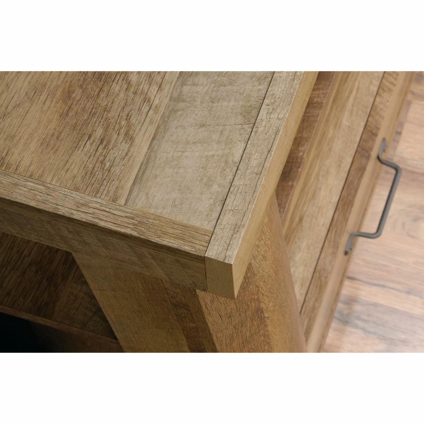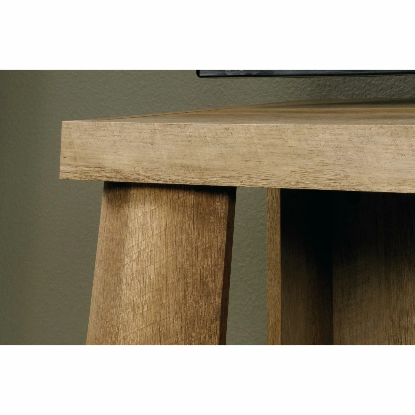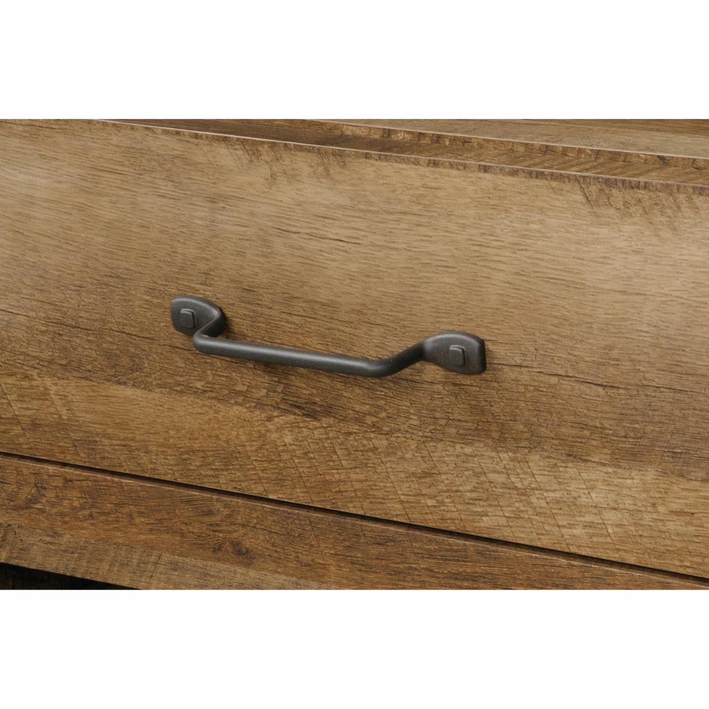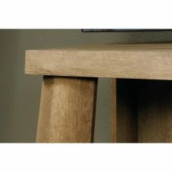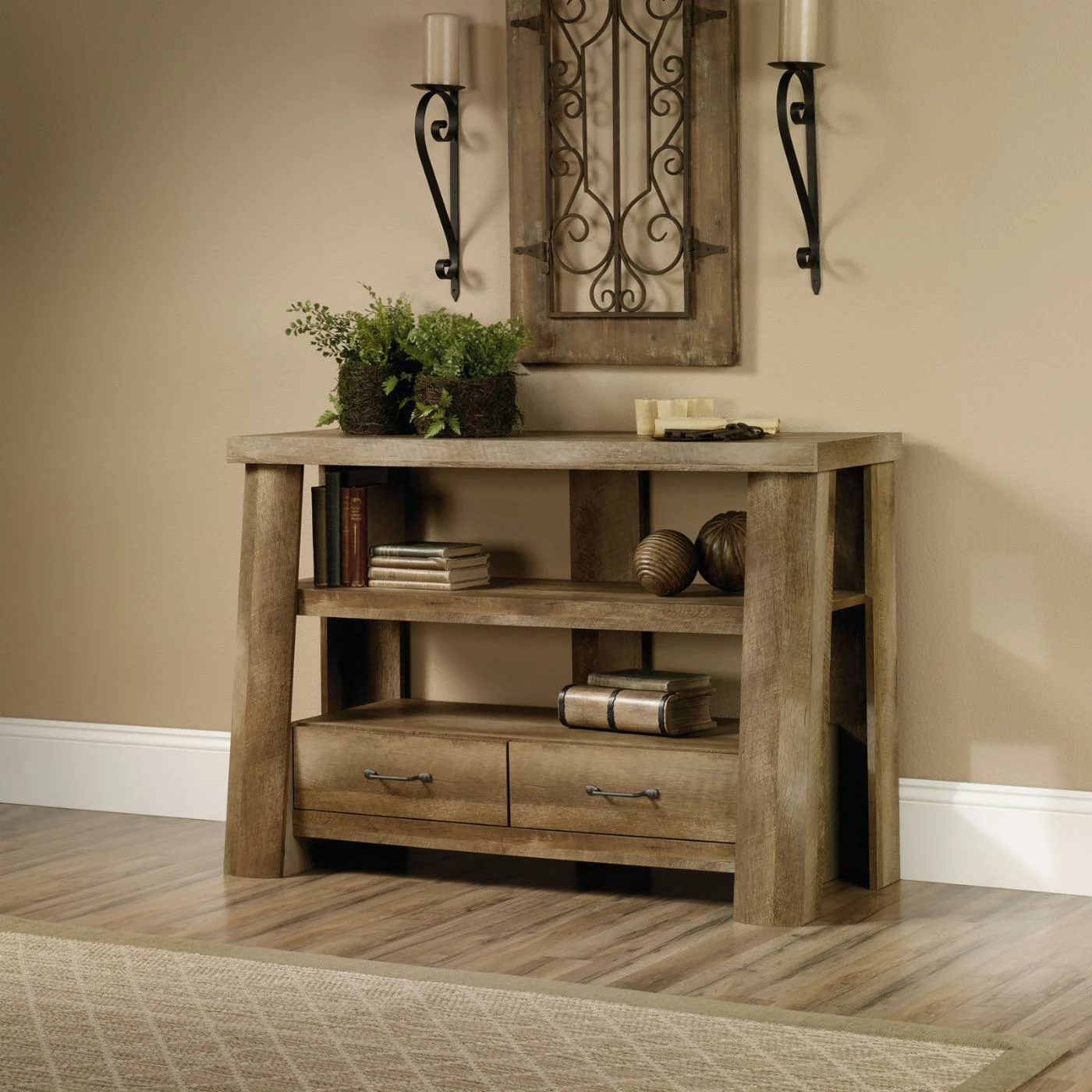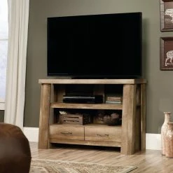 The rustic Sauder Boone Mountain Anywhere Console Table/TV Stand is a lodge-inspired design crafted of thick cut logs in a craftsman oak finish. The large top can support up to 70 lbs. and there are divided shelves for storing media or displaying photos and collectibles. Below are two drawer with metal runners and safety stops easily installed with the patented T-lock assembly system.
