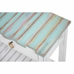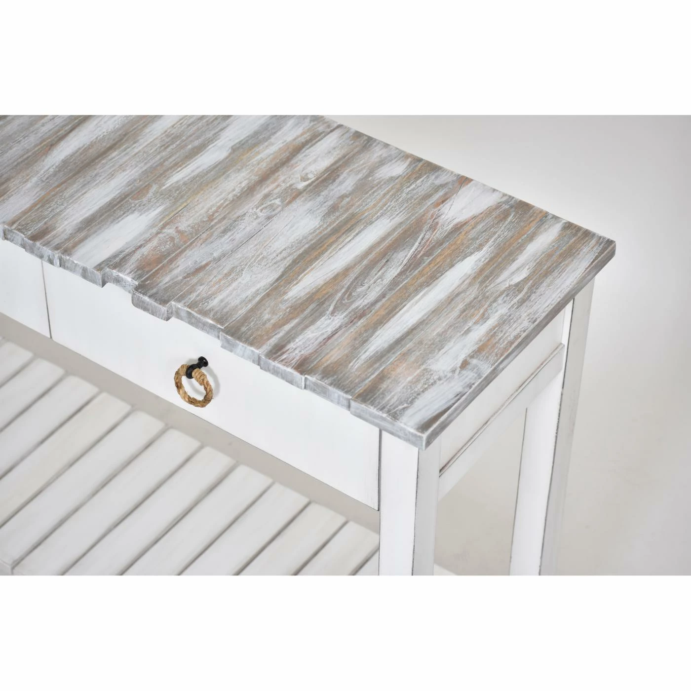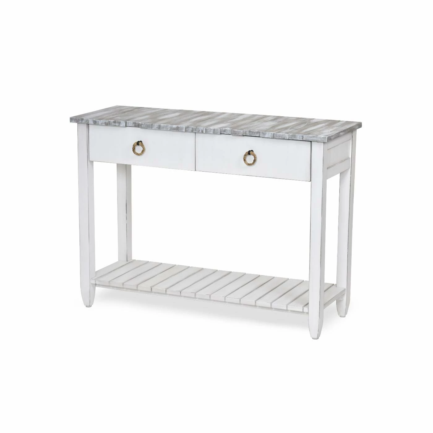The look of the Sea Winds Picket Fence Console Table has a casual coastal vibe and offers a robust structure for everyday use. This table is crafted from solid hardwood with a top inspired by reclaimed fence panels. The open lower shelf has a sturdy planked design. Below the unique top is a pair of storage drawers, each opening on full-extension, ball-bearing guides. Each drawer has a fully finished interior and a pull-ring made from natural rope. The painted finish on this console table features light distressing. Choose from available finish options.
