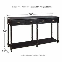 Storage and style are best friends when it comes to the Signature Design by Ashley Eirdale Console Table, making it your dream come true. From its turned legs to its framed drawer fronts, this console table is a study in classic elegance. Its veneers, solid, and engineered wood construction is topped in the available finish of your choosing for the perfect complement to your home. Four smooth-gliding drawers and one lower shelf give you excellent storage and display potential. Cupped metal drawer pulls in an antique bronze equip the drawers and lend a final chic flourish.