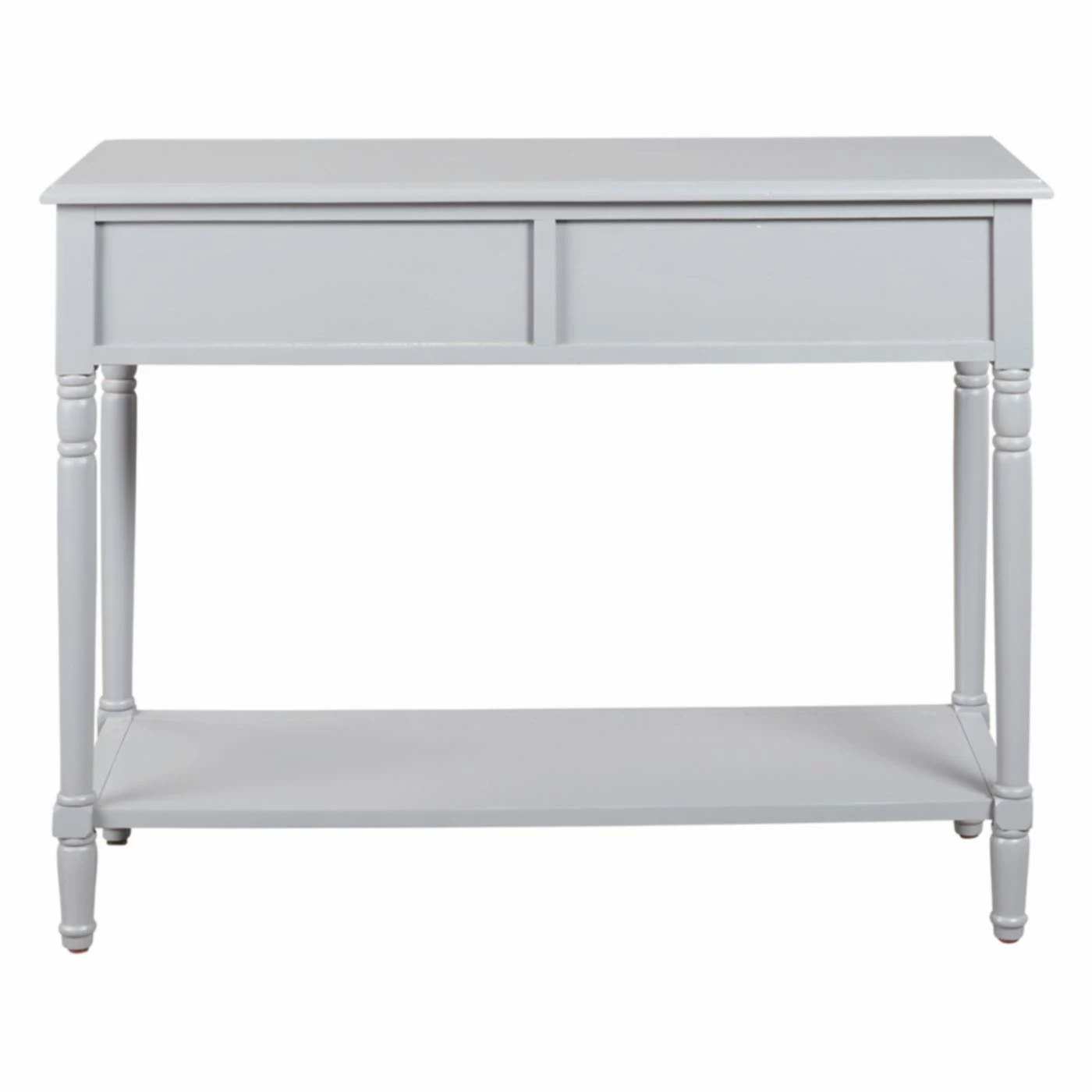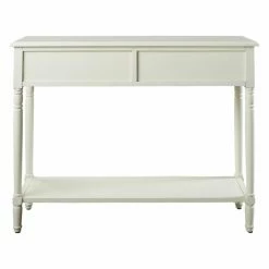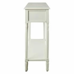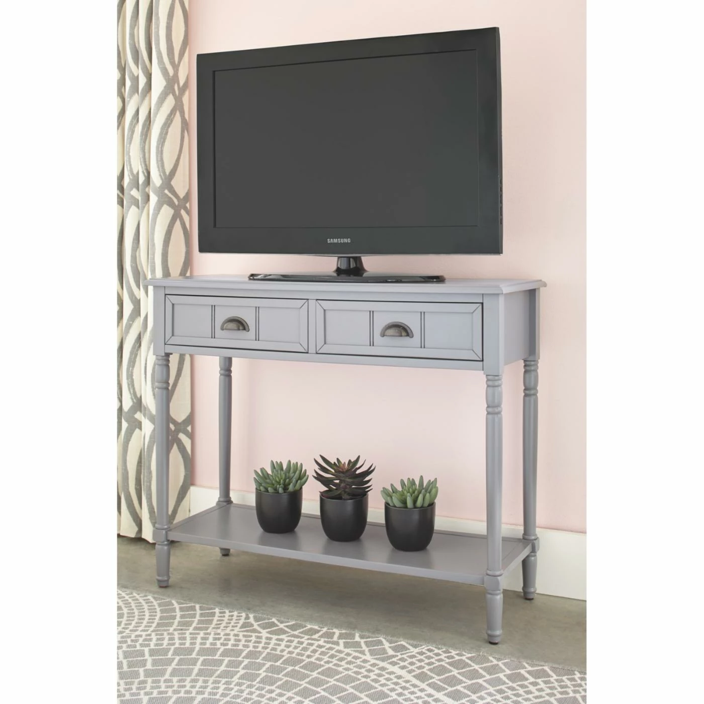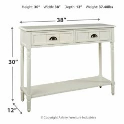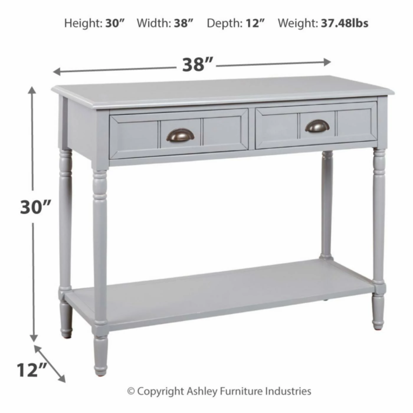 Classic elements are combined with crisp lines to produce the Signature Design by Ashley Goverton Console Table, a becoming piece with endless potential. This console table’s turned legs, framed drawer fronts, and antique bronze drawer pulls give a nod to the past while its clean angles and finishes are rooted in the present. Its two smooth-gliding drawers can store whatever you please while its spacious top can be home to your favorite decorative pieces. Select from the available finishes.