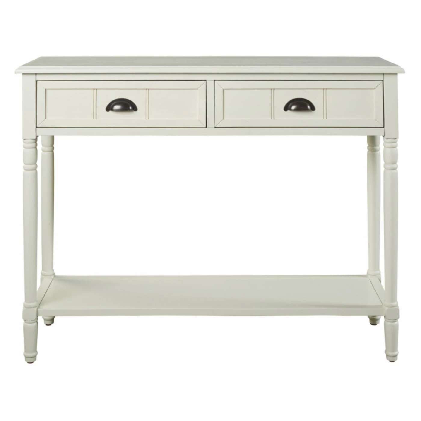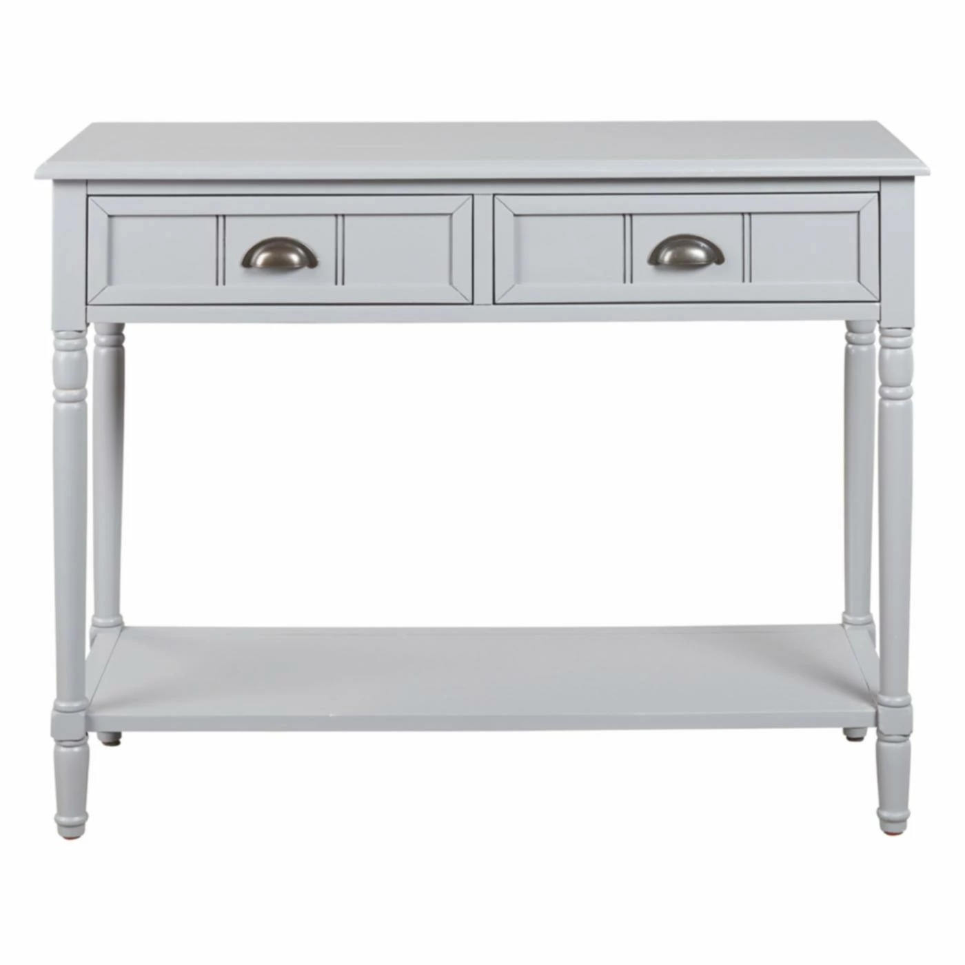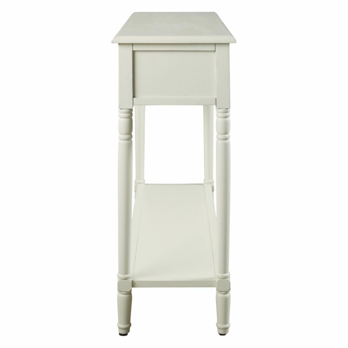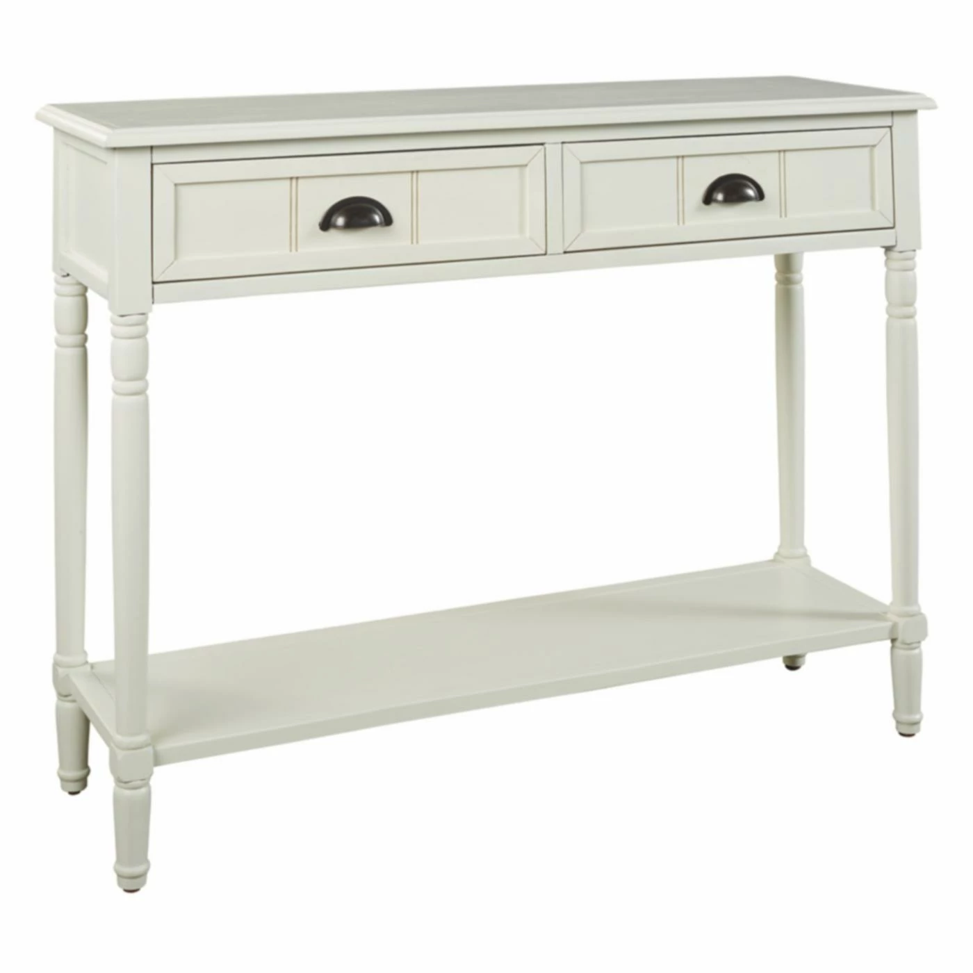 Classic elements are combined with crisp lines to produce the Signature Design by Ashley Goverton Console Table, a becoming piece with endless potential. This console table’s turned legs, framed drawer fronts, and antique bronze drawer pulls give a nod to the past while its clean angles and finishes are rooted in the present. Its two smooth-gliding drawers can store whatever you please while its spacious top can be home to your favorite decorative pieces. Select from the available finishes.