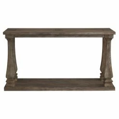 Display the Signature Design by Ashley Johnelle Sofa Table behind a sofa or in the entry of your traditional home. This sofa table features a durable construction with a lightly distressed gray finish for a loved-over-time appearance. The elegant style of the wood feet draws the eye to the lower display shelf of this sofa table.