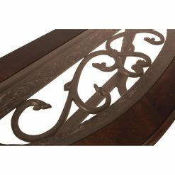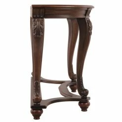 Rich details and a graceful demilune shape make this Signature Design by Ashley Norcastle Sofa Table a stately addition to your foyer or behind the sofa. This demilune sofa table features a wood framed top with cast filigree pattern under clear beveled float glass. Cabriole legs feature acanthus leaf carvings and end in lion paw feet. A shapely wood shelf and bun feet add stylish stability. This sofa table is crafted of hardwood solids and select birch veneers in a dark brown finish.