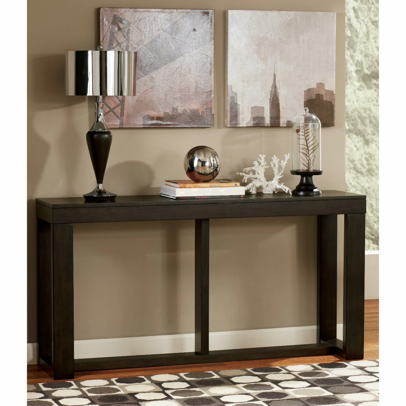 It’s elementary, my dear, the Signature Design by Ashley Watson Sofa Table is an essential piece of any contemporary living space. This sofa table stands tall and lean, making it perfect in your hallway, foyer, or behind the sofa. Clean lines are made of solid hardwoods and ash veneers in a dark brown stained finish.