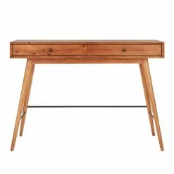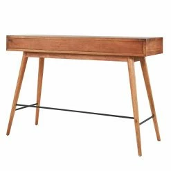 Use the Weston Home Alcott Sofa Table in your entryway to bid guests a warm mid-century welcome. This sofa table is built of rubberwood and veneers in a natural brown finish. It stands on long, lean, and flared wood dowel legs with dark metal stretchers. Its two box drawers operate on side-mounted metal glides for smooth, dependable use.